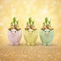 3. Feestelijke mix - cellofaan en chocolade paaseieren: Voor een extra dosis vreugde wordt het product verpakt in sierlijk cellofaan met geel krullint, vergezeld door een feestelijke mix van chocolade paaseieren.