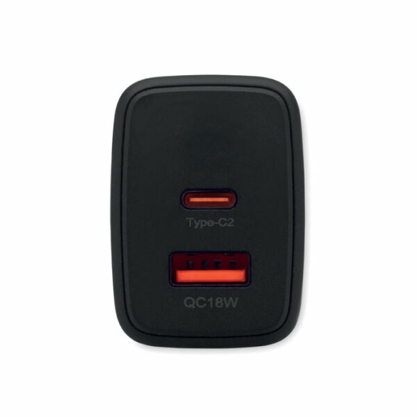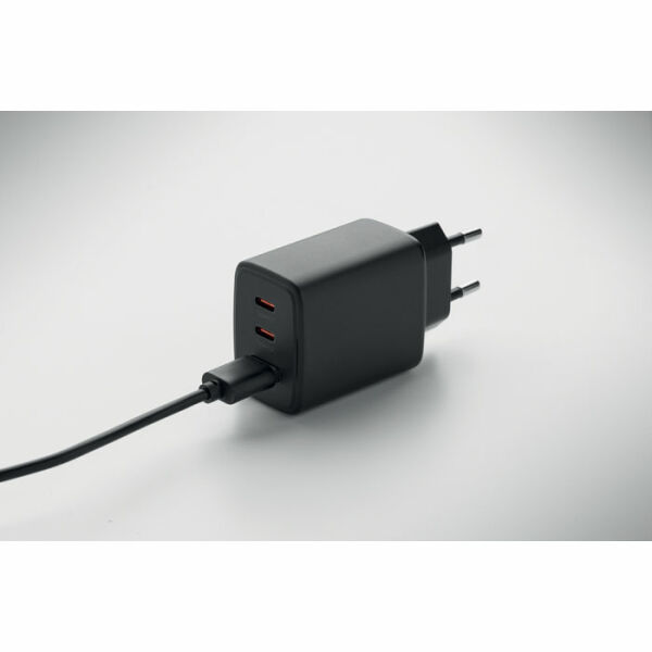 EU 2-polige GaN-wandlader met 65W snellaadfunctie, 1 USB-A en 1 Type-C poorten. Ondersteunt Power Delivery-technologie.